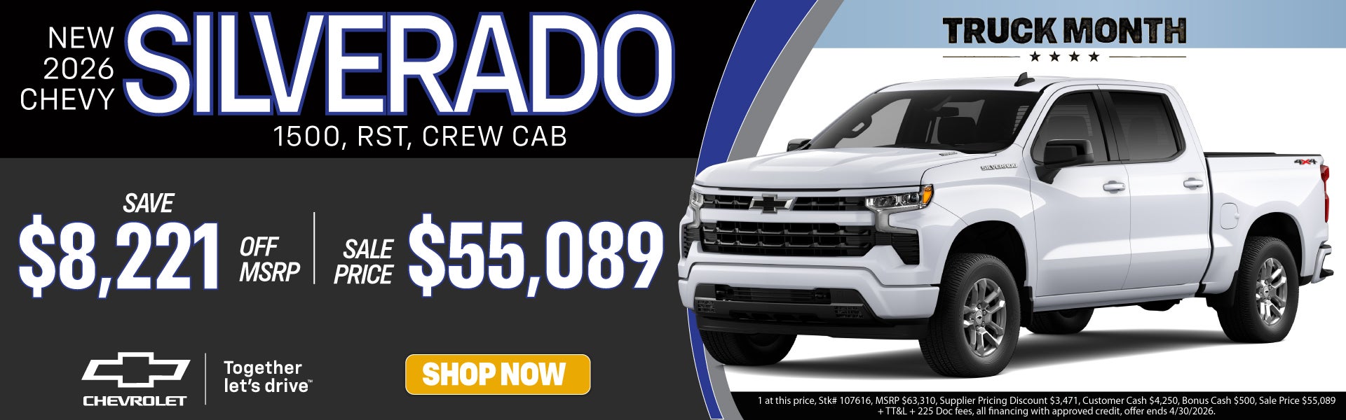 1 at this price, Stk# 107616, MSRP $63,310, Supplier Pricing Discount $3,471, Customer Cash $4,250, Bonus Cash $500, Sale Price $55,089 + TT&L + $225 Doc Fees, all financing with approved credit, offer ends 4/30/26.